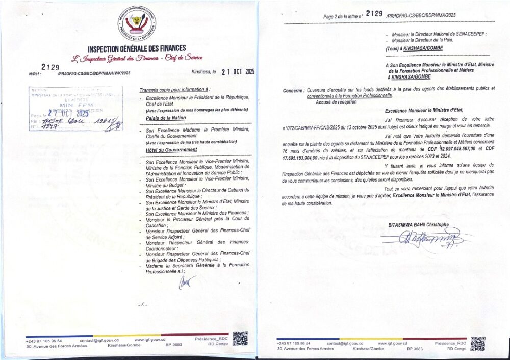 Le ministre d’Etat Marc Ekila Likombo parait déterminé à mettre de l’ordre dans le secteur de la formation professionnelle en République démocratique du Congo. C’est ainsi qu’il avait dernièrement sollicité par écrit l’Inspection générale des finances-IGF- pour ouvrir une enquête sur les fonds destinés à la paie des agents des établissements publics et conventionnés à la formation professionnelle. L’Inspecteur général chef de service, Christophe Bitasimwa Bahii, lui a donné une réponse favorable par sa lettre datée du 21 octobre 2025.
