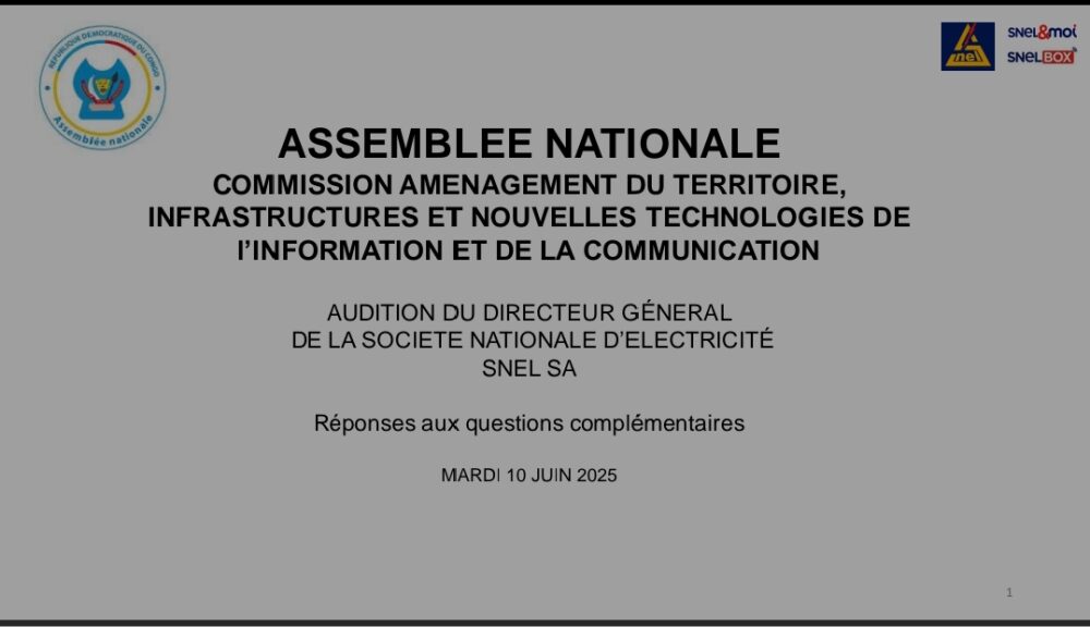 Invité par la Commission Aménagement du Territoire, Nouvelles Technologies de l’Information et de la Communication -ATI-NTIC-, le Directeur général de la Société nationale d’électricité, Fabrice Lusinde wa Lusangi, a été auditionné le vendredi 6 juin 2025 à l’Assemblée nationale. Cette séance s’inscrivait dans le cadre du contrôle parlementaire sur la gestion des entreprises publiques.