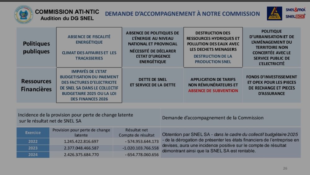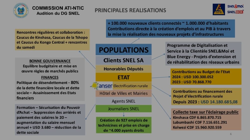 Face aux députés membres de la commission présidée par la députée Caroline Bemba, le DG de la SNEL a livré une présentation structurée de l’état de la société qu’il dirige, abordant plusieurs axes essentiels. Il a notamment exposé les efforts consentis dans la gestion des ressources humaines, la production, la distribution, ainsi que les difficultés rencontrées par l’entreprise publique dans l’accomplissement de sa mission de service public.