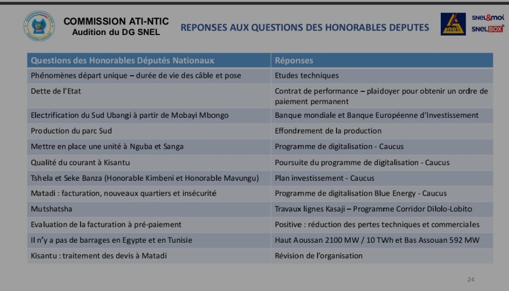 Pour ce qui du plan de la SNEL SA, le DG Lusinde a indiqué ce qui suit :