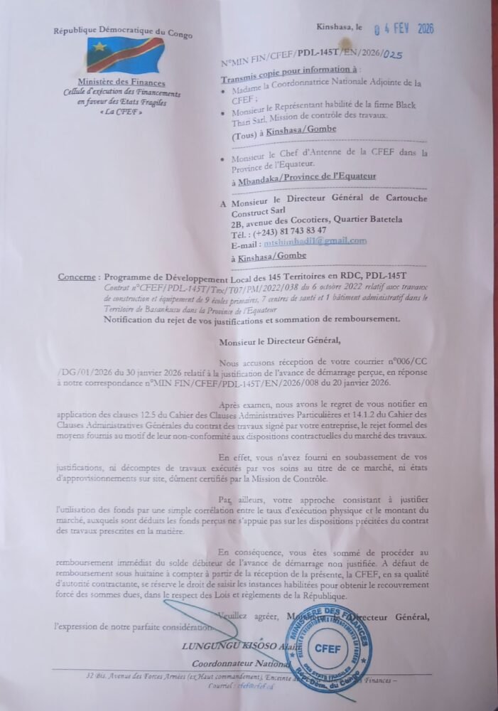 Dans une correspondance signée par le Coordonnateur national, Lungungu Kisoso Alain, l’autorité contractante estime que les pièces transmises par l’entreprise ne satisfont pas aux exigences prévues par les clauses administratives du contrat. Le marché porte sur la construction et l’équipement de neuf écoles primaires, sept centres de santé et un bâtiment administratif dans le territoire de Basankusu, province de l’Équateur.