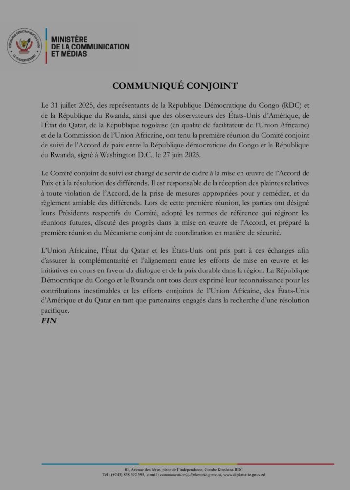 Le 31 juillet 2025, des représentants de la République Démocratique du Congo (RDC) et de la République du Rwanda, ainsi que des observateurs des États-Unis d’Amérique, de l’État du Qatar, de la République togolaise (en qualité de facilitateur de l’Union Africaine) et de la Commission de l’Union Africaine, ont tenu la première réunion du Comité conjoint de suivi de l’Accord de paix entre la République démocratique du Congo et la République du Rwanda, signé à Washington D.C., le 27 juin 2025.