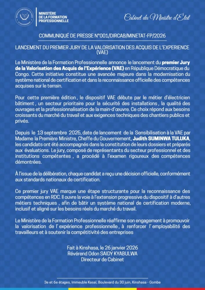 Le Ministère de la Formation Professionnelle a le plaisir d’annoncer le lancement du premier Jury de la Valorisation des Acquis de l’Expérience (VAE) en République Démocratique du Congo. Cette initiative constitue une avancée majeure pour la modernisation du système national de certification et pour la reconnaissance officielle des compétences acquises sur le terrain.