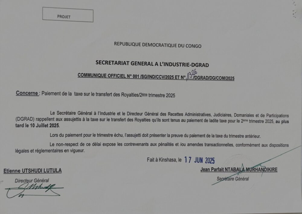 Le Secrétaire Général à b l’industrie et le Directeur Général des Recettes Administratives, Judiciaire, Domaniales et de Participations ( DGRAD) rappellent aux assujettis à la taxe sur sur le transfert des Royalties qu’il sont tenus au paiement de ladite taxe pour le 2 ème trimestre 2025 au plus tard le 10 juillet 2025.