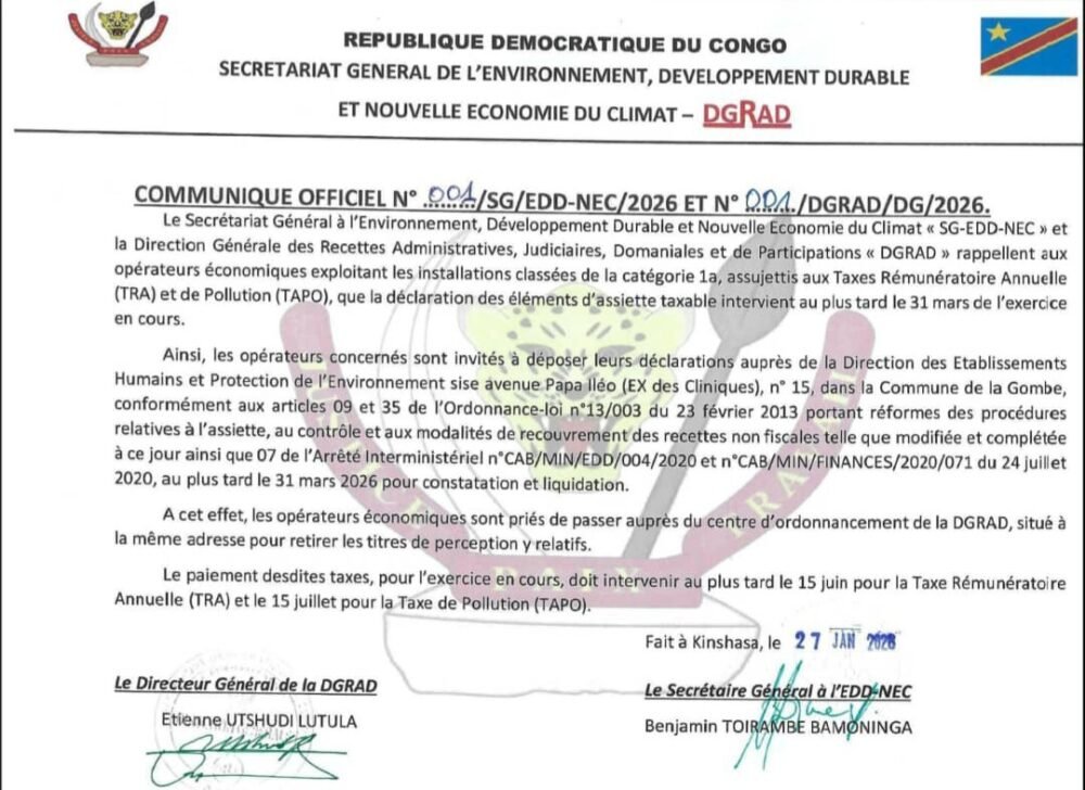 Le Secrétariat Général à l’Environnement, Développement Durable et Nouvelle Économie du Climat (SG-EDD-NEC) et la Direction Générale des Recettes Administratives, Judiciaires, Domaniales et de Participations (DGRAD) portent à la connaissance des opérateurs économiques exploitant des installations classées de la catégorie 1a, assujetties à la Taxe Rémunératoire Annuelle (TRA) et à la Taxe de Pollution (TAPO), que :