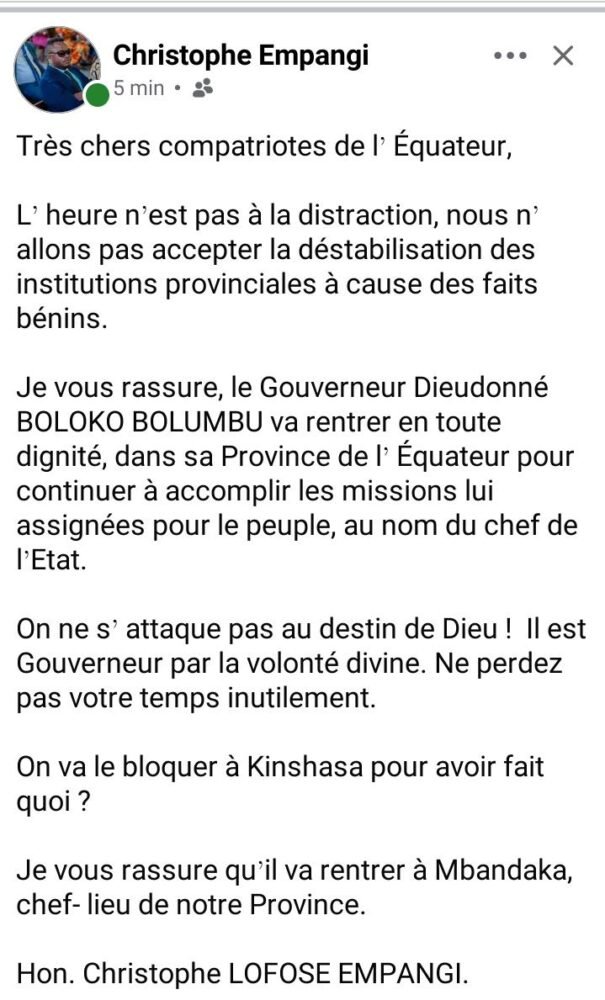 Equateur : Mise en garde contre le Député National Christophe Lofose Empangi après ses prises de position en faveur du gouverneur Bobo Boloko Bolumbu