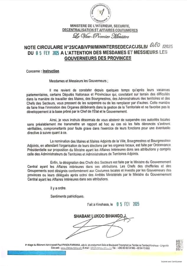 Cette réaction du ministre de l’Intérieur a été motivée par le constat selon lequel certains députés nationaux et provinciaux, constatant des difficultés rencontrées sur le terrain par les autorités locales dans leur manière de travailler, pressent les gouverneurs des provinces de les suspendre ou les remplacer par d’autres. « Cette manière de faire frise l’immixtion des organes délibérants dans la gestion de la Territoriale et ne favorise pas le développement à la base prôné par le chef de l’État et le gouvernement », a expliqué le ministre Jacquemain Shabani.