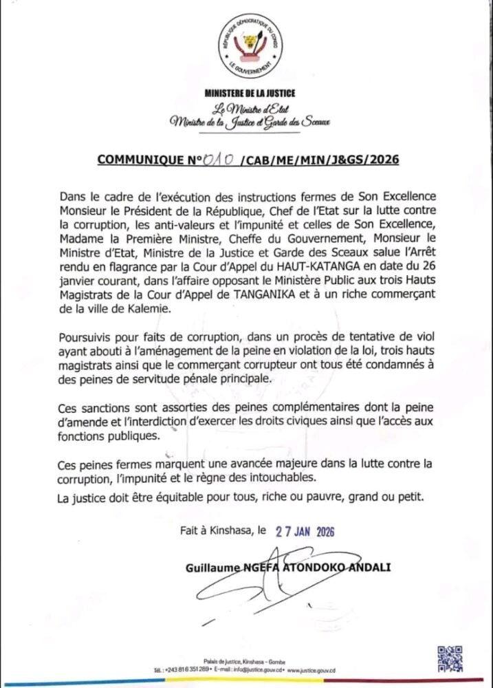 Dans un communiqué officiel publié le 27 janvier 2026 à Kinshasa, le ministre d’État a rappelé que cette condamnation s’inscrit dans la mise en œuvre des instructions fermes du Président de la République, Félix Antoine Tshisekedi Tshilombo, et de la Première ministre, visant à éradiquer la corruption et les pratiques illégales au sein de l’appareil judiciaire.