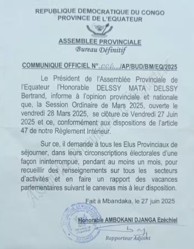 Curieusement, cet arrêt souffre de son exécution par les autorités provinciales. En effet, des sources concordantes, l’on apprend que le gouverneur Bobo Boloko a carrément instruit les députés provinciaux qui sont de sa dynamique, de procéder sans autre forme de procès, à la fermeture de l’Assemblée provinciale de l’Equateur. Pour cela, il a signé un simple communiqué, ce qui est contraire à la loi. Il appartient à présent, à la Cour constitutionnelle de tirer les oreilles à ce gouverneur qui se comporte comme s’il était en territoire conquis. Pour preuve, quelques jours plus tôt, il avait fait voyager deux membres du Bureau et convaincu un autre de se déclarer malade. Une manœuvre bien calculée pour bloquer le quorum.