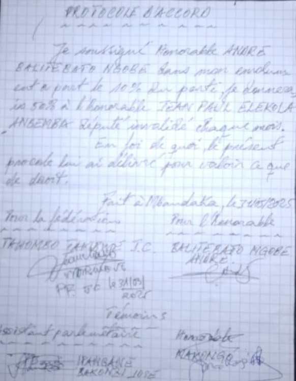 Tel a été le cas de Jean-Paul Elekola. Elu député provincial de l’Equateur, ce dernier avait, pendant la campagne électorale, signé un protocole d’accord avec son suppléant André Balitebato Ngobé. Au terme de cet arrangement conclu le 31 mai 2025, celui-ci devait lui verser sur son émolument 50%, 10% au parti AFDC et lui-même devait empocher 40%.