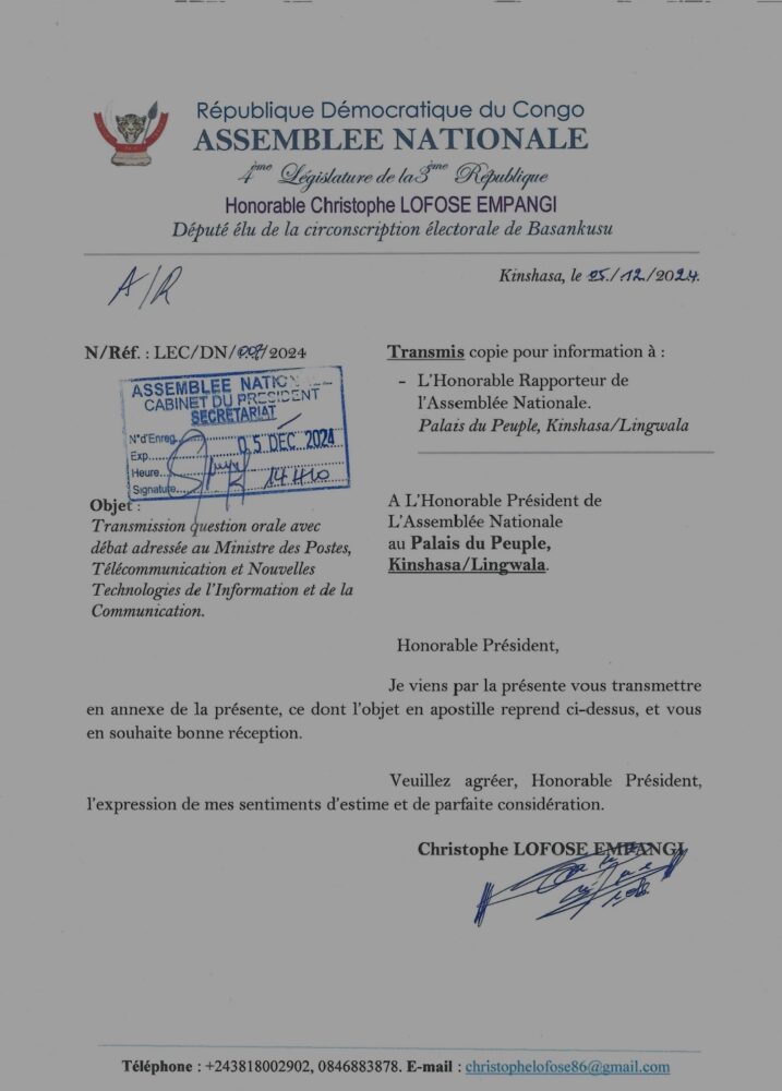 Bien que la situation se soit un peu améliorée, Christophe Lofose Empangi, député élu de la circonscription électorale de Basankusu, ne pouvait pas se taire. Il a donc profité de la session actuelle de l’Assemblée nationale pour interpeller Kibassa Maliba, ministre en charge des postes, télécommunications et nouvelles technologies de l’information et de la communication, à travers la question orale avec débat qu’il lui a adressée le 5 décembre 2024.