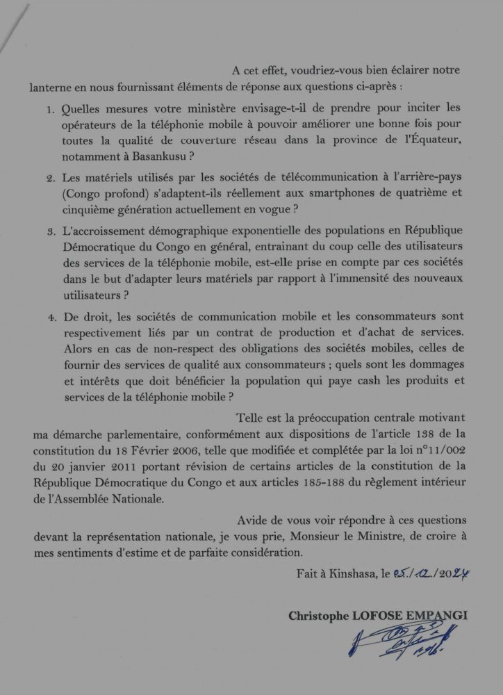 Désireux d’éclairer la lanterne de la représentation nationale sur cette situation, le député Christophe Lofose adresse au ministre des postes, télécommunications, et nouvelles technologies de l’information et de la communication, quatre questions. La première consiste à connaitre les mesures que son ministère compte prendre pour inciter les opérateurs de téléphonie mobile à améliorer une bonne fois pour toutes, la qualité de couverture réseau dans la province de l’Equateur, singulièrement dans le territoire de Basankusu. La seconde consiste à savoir si les matériels que les sociétés de téléphonie mobile utilisent dans le Congo profond s’adaptent réellement aux smartphones de quatrième et cinquième génération actuellement en vogue. Par la troisième question, le député national se demande si l’accroissement exponentielle des populations en République démocratique du Congo, qui occasionne du coup celui des utilisateurs des services de la téléphonie mobile, est pris en compte par ces sociétés de téléphonie mobile en vue d’adapter leurs matériels à cette nouvelle donne. Enfin, la quatrième et dernière préoccupation du député national porte sur les dommages et intérêts auxquels la population peut s’attendre, en cas de non-respect des obligations par les sociétés de téléphonie mobile de fournir des services de qualité aux consommateurs.