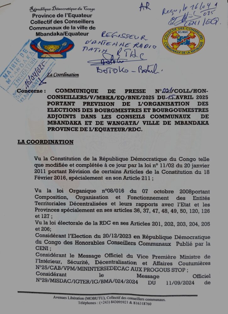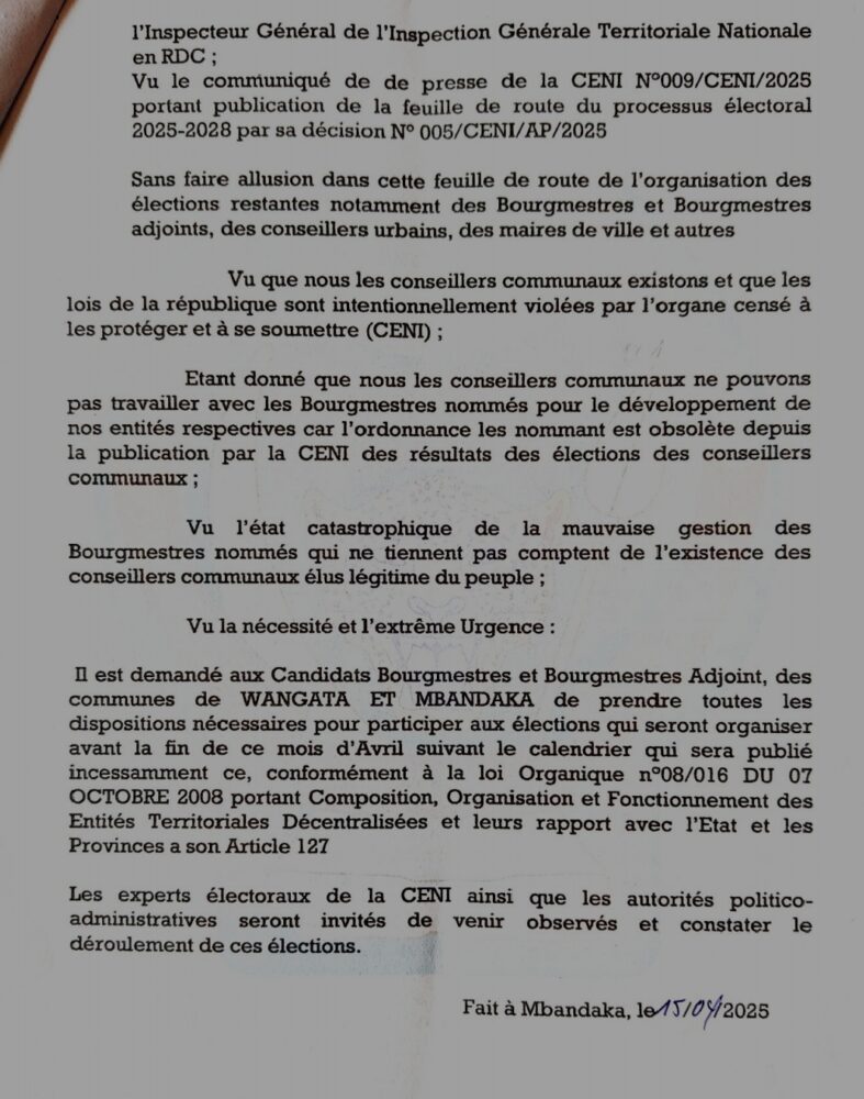 Le Collectif des conseillers communaux de la ville de Mbandaka ainsi que les candidats Bourgmestres et conseillers Urbains, de la commune de Wangata et Mbandaka, avons appris avec regret la décision unique prise par la CENI, suite de l’annulation des élections des bourgmestres, bourgmestres adjoints et conseillers urbains sur l’ensemble du territoire national en général et la ville de Mbandaka en particulière dans son récent communiqué de presse n° 005/CENI/AP/2025 du 04 avril 2025.