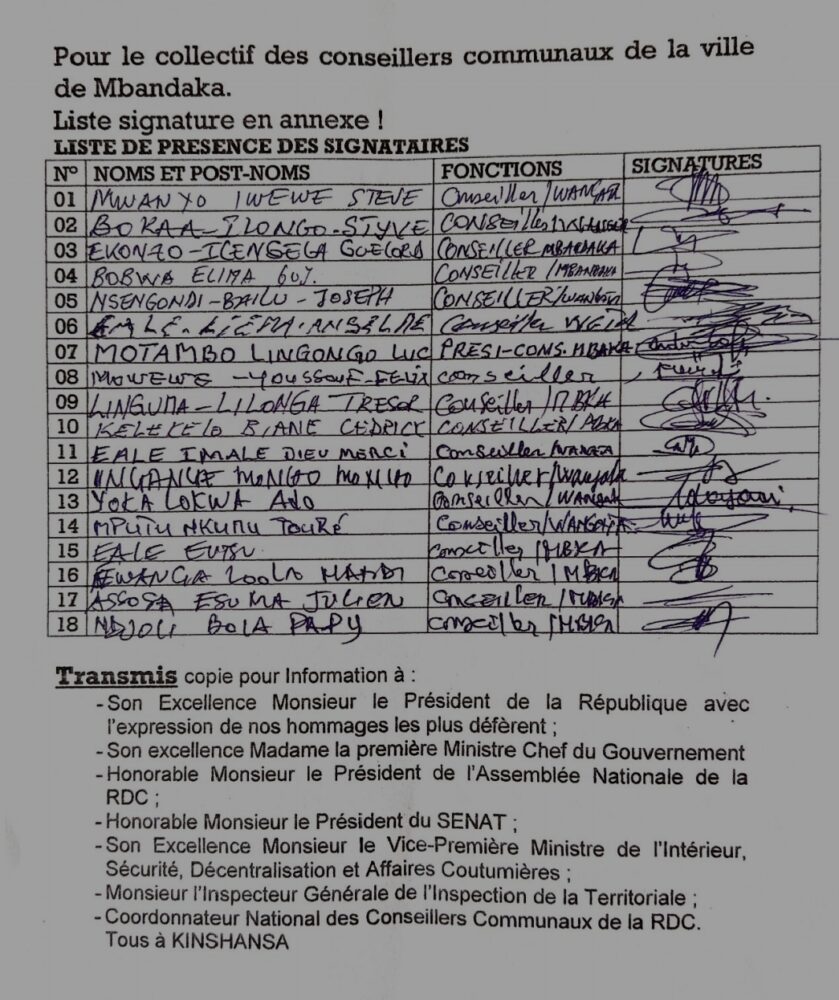 Le COLLECTIF Provincial de l’Équateur de la ville de Mbandaka, les Élus Honorables CONSEILLERS COMMUNAUX, réclame face A LA DECISION DE LA CENI PORTANT ANNULATION DES ELECTIONS DES BOURGMESTRES, BOURGMESTRES ADJOINTS ET CONSEILLERS URBAINS du processus électoral du 20 janvier 2023.