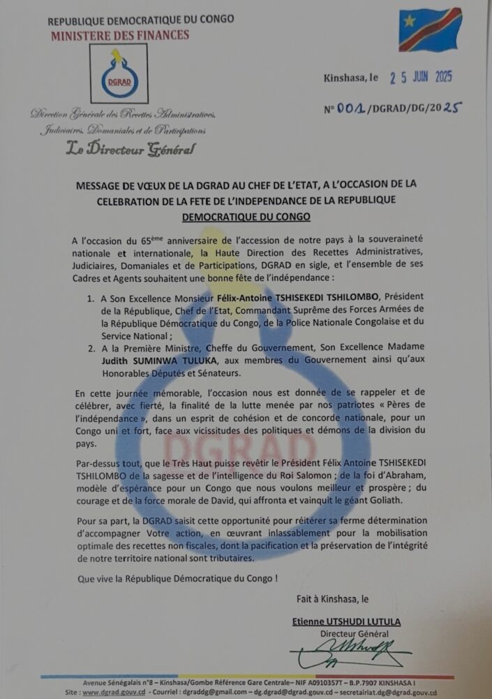 A l’occasion du 65 ème anniversaire de l’accession de notre pays à la souveraineté nationale et internationale, la Haut Direction des Recettes Administratives, Judiciaire, Domaniales et de Participations, DGRAD en sigle, et l’ensemble de ses Cadres et Agents souhaitent une bonne fête de l’indépendance :