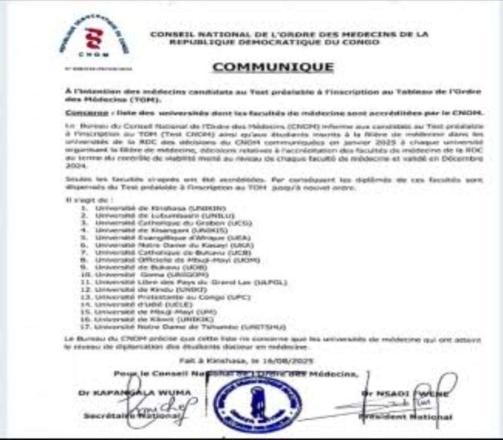 Le CNOM a publié récemment la liste des universités dont les facultés de médecine sont accréditées en République Démocratique du Congo.