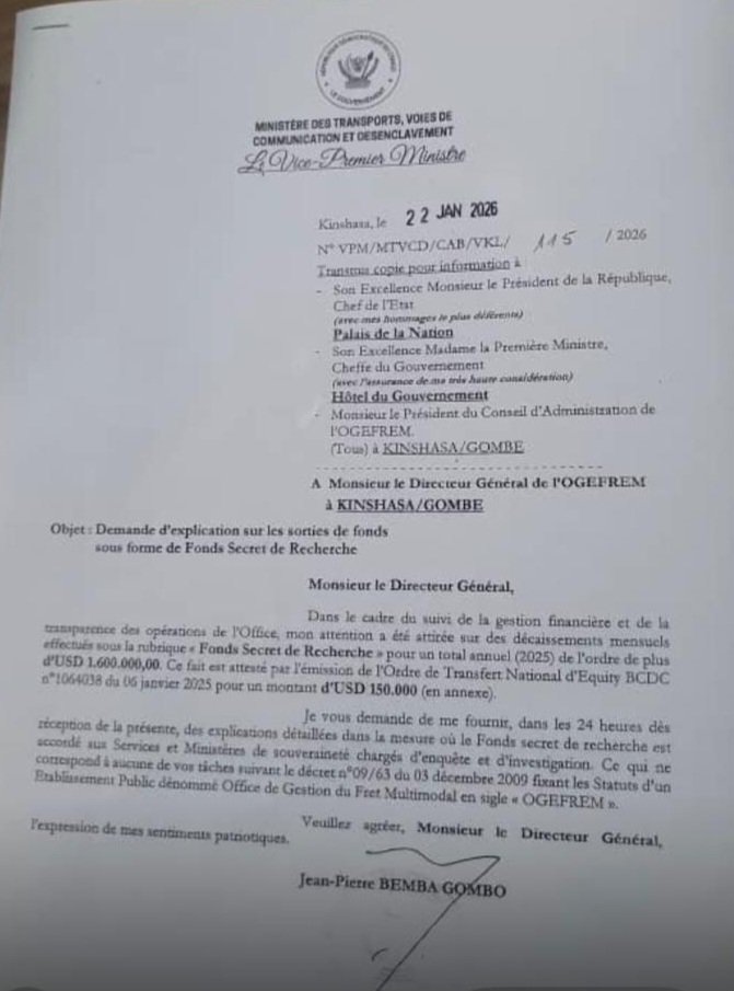 Le Vice-Premier ministre en charge des Transports, Voies de communication et Désenclavement, Jean-Pierre Bemba Gombo, a exigé des explications formelles du Directeur général de l’Office de Gestion du Fret Multimodal (OGEFREM), William Kazumba, au sujet de fonds financiers jugés opaques et disparus sans justification claire.