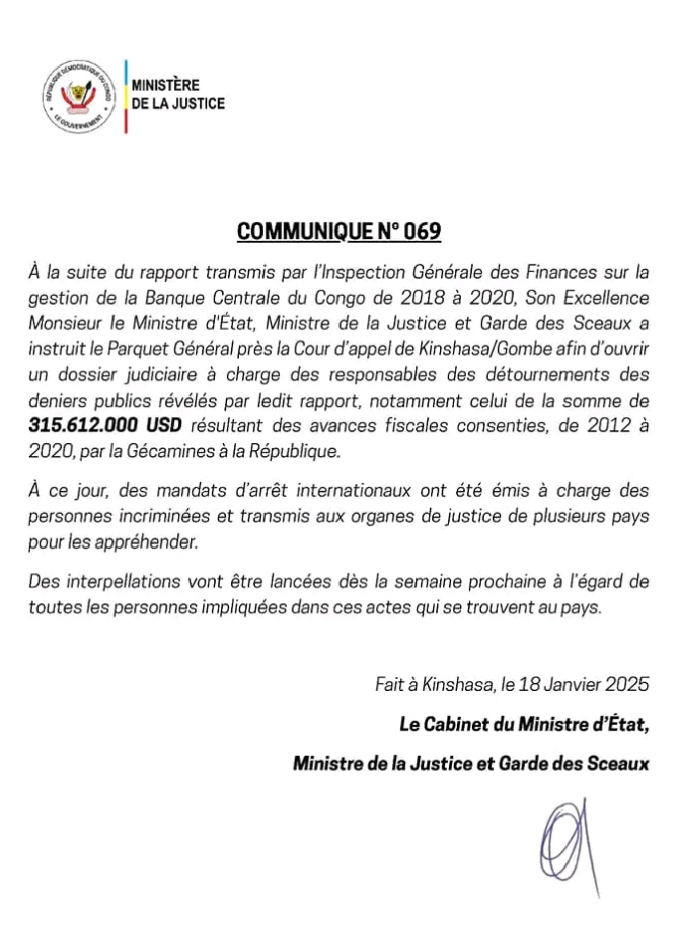 C’est ainsi qu’à la suite du rapport de l’Inspection générale des Finances sur la gestion de la Banque Centrale du Congo –BCC- entre 2018 et 2020, le ministre d’État en charge de la Justice et Garde des Sceaux, Constant Mutamba, vient d’ordonner l’ouverture d’une enquête judiciaire contre les responsables des détournements de fonds publics, notamment une somme de 315,612 millions de dollars provenant d’avances fiscales accordées par la Gécamines à la République entre 2012 et 2020.