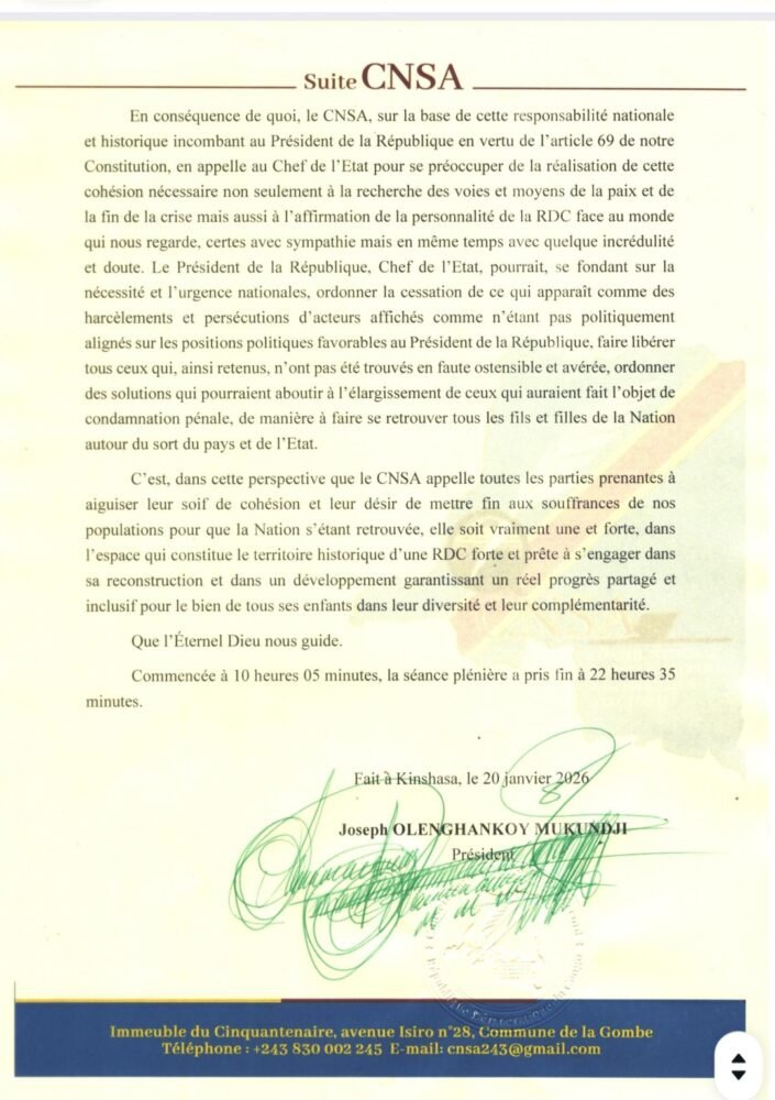 La séance plénière, qui a duré de 10h05 à 22h35, reflète la volonté du CNSA de mobiliser tous les acteurs autour d’une vision partagée pour la RDC.