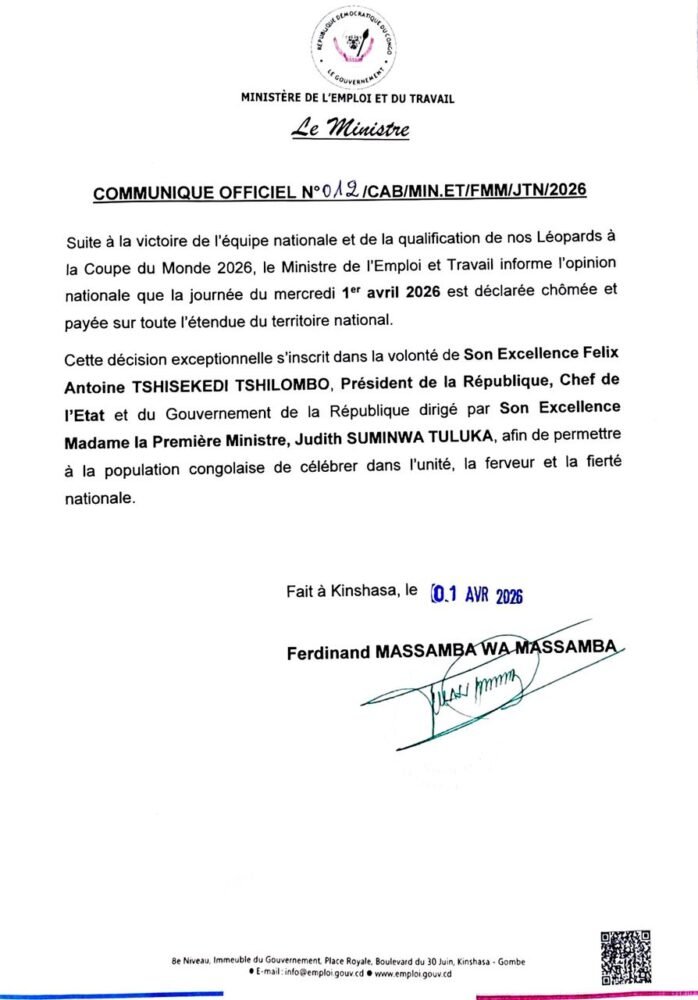 L’annonce a été faite à travers un communiqué officiel signé par le ministre de l’Emploi et du Travail, Ferdinand Massamba Wa Massamba. Cette décision exceptionnelle intervient à la suite de la victoire décisive des Léopards, synonyme de leur retour sur la scène mondiale, 52 ans après leur unique participation en 1974.