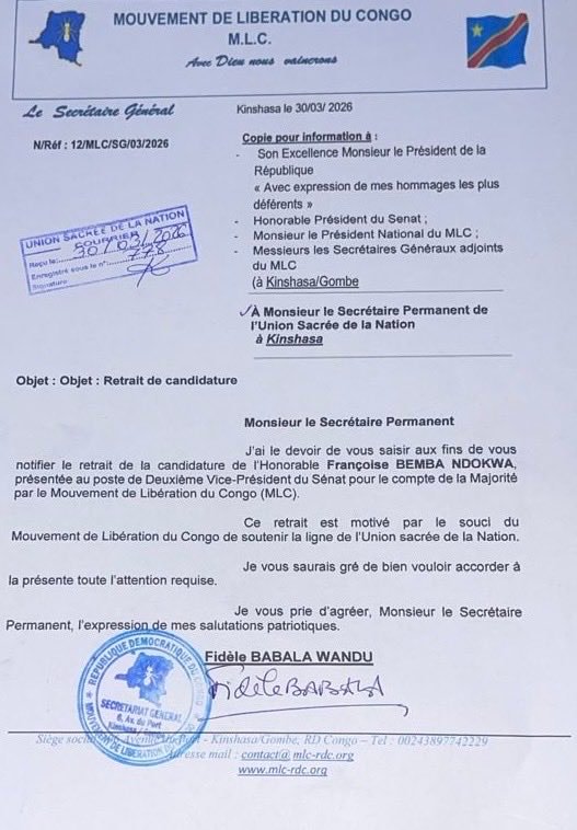 Le Mouvement de Libération du Congo (MLC) a officiellement annoncé le retrait de la candidature de l’honorable Françoise Bemba Ndokwa au poste de Deuxième Vice-Président du Sénat. Cette décision, rendue publique à travers une correspondance signée par le Secrétaire général du parti, Fidèle Babala Wandu, s’inscrit dans une logique de discipline politique et de consolidation de la majorité au pouvoir.