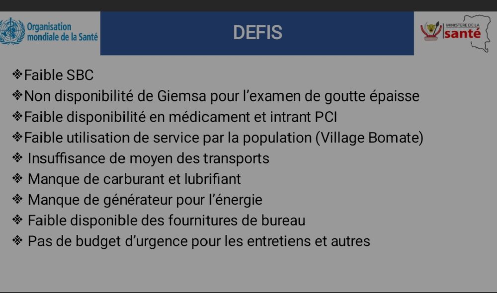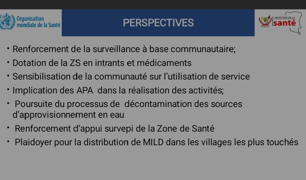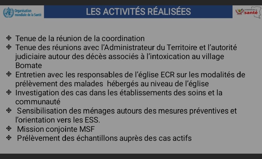 Par ailleurs, pendant cette période, d’importantes activités ont été menées, notamment la tenue des réunions avec la coordination de la zone de santé et l’administrateur du territoire, et l’autorité judiciaire autour des cas de décès associés à l’intoxication dans le village Bomate, l’entretien avec les responsables de l’église ECR sur les modalités de prélèvement des malades hébergés sur place.