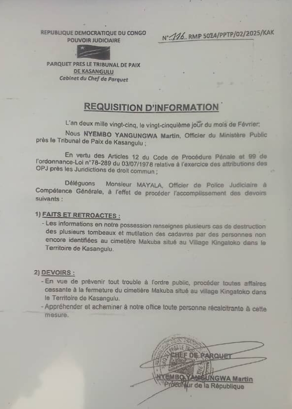 Pourtant, par sa réquisition d’information n°116/RMP.504/PPTP/02/2025/KAK, le Parquet près le Tribunal de paix de Kasangulu, avait ordonné la fermeture immédiate du cimetière Makuba situé au village Kingatoko dans le territoire de Kasangulu. Curieusement, le même Administrateur du territoire a même accroché sur le mur de son bureau, sa photo avec le Sphinx Etienne Tshisekedi de pieuse mémoire, alors que l’illustre leader politique avait fustigé des antivaleurs dans sa vie. Sous la pression des délégués venus de Kionshasa, l’AT de Kasangulu va appeler les responsables du cimetière pour leur annoncer le retrait de l’autorisation du cimetière dénommé Beau Jardin qu’il leur avait accordée.