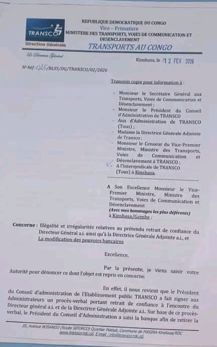 La Société des Transports au Congo (TRANSCO) traverse une crise majeure. Le Directeur Général par intérim, Sylvestre Bilambo Likwey, se retrouve en bras de fer avec le Président du Conseil d’Administration (#PCA), Jean-Claude Dumbi, plongeant l’entreprise dans une situation critique.