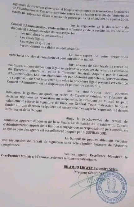 Dans une lettre adressée au Vice-Premier Ministre des Transports, Sylvestre Bilambo a dénoncé une tentative d’éviction illégale, qualifiant la démarche du Conseil de « putsch administratif ». Selon lui, le Conseil n’a aucun pouvoir légal pour le révoquer.